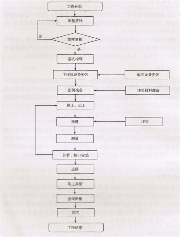 頂管施工就是借助主頂油缸及管道間的中繼間等的推力,把工具管或掘進機從工作坑內(nèi)穿過土層一直推到接收坑內(nèi)后回收的過程。與此同時,也就把緊隨工具管或掘進機后的管道埋設(shè)在了兩坑之間,頂管施工示意圖如圖1.1所示。一個比較完整的頂管施工大體包括以下部分。